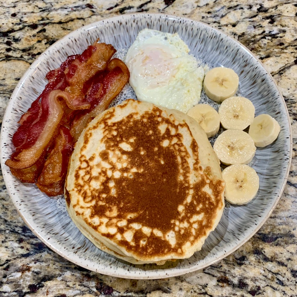 - Once you finish the pancakes (brushing the pan with oil between each one) the bacon should be about done too.
